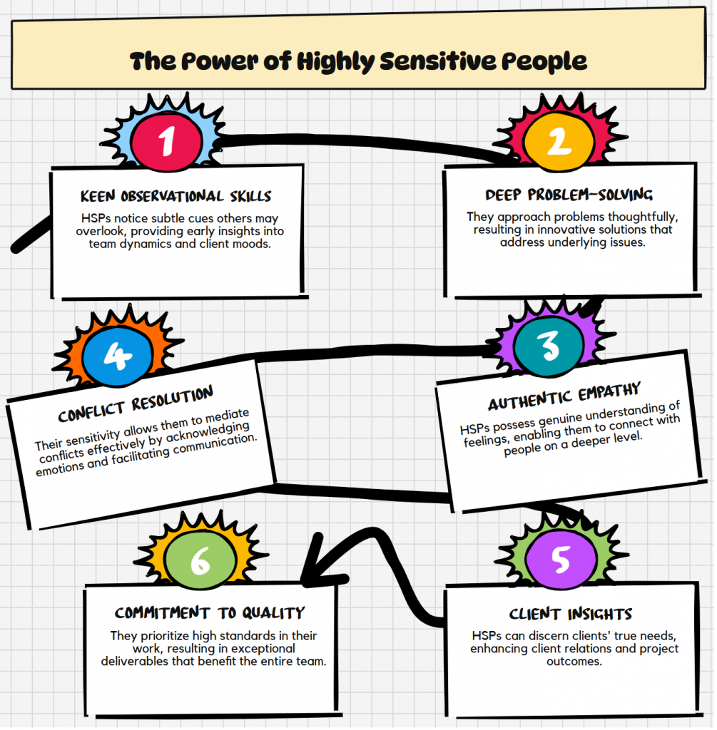 They notice what others miss. Shifts in client mood, early warning signs in projects, subtle changes in team dynamics. Your HSP team member is picking this up before anyone else even realises something is happening.